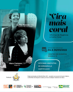 Música e formação. De 6 de fevereiro a 1º de março, estão abertas as inscrições para Oficinas de Regência e Canto Coral, que ocorrem ainda no mês de março no Centro de Eventos Rodeio 12, em Santa Catarina. Organizado pela Associação Coral Leopoldo Kurtz, de Timbó, as oficinas serão ministradas pela professora de técnica vocal, Lúcia de Moura Passos, do Rio Grande do Sul; e pela maestrina Mara Campos, de São Paulo; expoentes do canto e regência no Brasil. As ações são gratuitas, em formato presencial, e fazem parte do projeto VIVA MAIS CORAL, que tem por objetivo realizar processos formativos voltados a regentes, cantores e musicistas em geral.