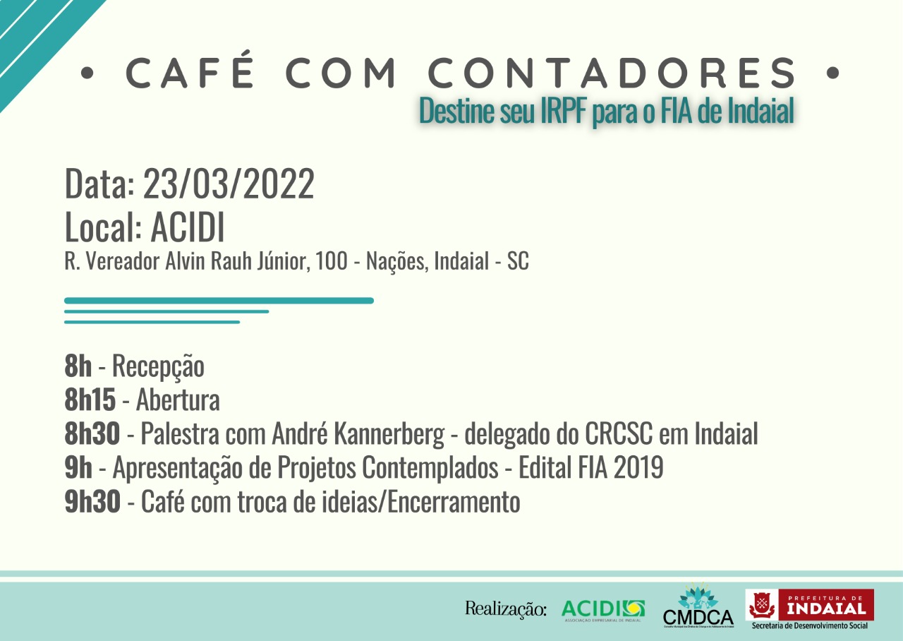 A Secretaria de Desenvolvimento Social e o Conselho Municipal dos Direitos da Criança e Adolescente (CMDCA), em parceria com a Associação Empresarial de Indaial, convidam as Organizações da Sociedade Civil, empresas doadoras e comunidade em geral para participarem do evento “Café com Contadores”, no dia 23 de março, às 8h, na Acidi (R. Ver. Alvin Rauh Júnior, 100, Nações).
