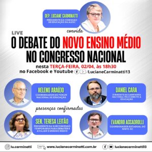 A deputada Luciane Carminatti (PT), presidente da Comissão de Educação da Assembleia Legislativa, está organizando evento on-line para discutir o projeto de lei em tramitação no Congresso que corrige aspectos do novo ensino médio, aprovado em 2017. A transmissão será feita pelo YouTube e pelo Facebook da parlamentar, hoje terça-feira (02), a partir das 18h30.