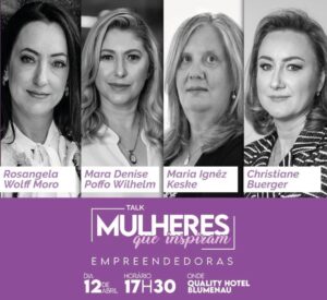 Amanhã, dia 12 de abril, ocorre em Blumenau um evento dedicado ao empreendedorismo e networking feminino. É o talk Inspire-se, que marca o encerramento da segunda edição do projeto Mulheres que Inspiram, alusivo a uma homenagem realizada durante o mês de março para as mulheres e contará com a presença da advogada Rosangela Wolff Moro; Mara Denise Poffo Wilhelm, advogada e representante da Contax Contabilidade e Planejamento Tributário, Maria Ignêz Keske, sócia e proprietária da WK Sistemas, Christiane Buerger vice-presidente da Associação Empresarial de Blumenau (Acib) e sócia-proprietária da Ártico, Cristiane Soethe Zimmermann, jornalista e sócia-proprietária da Presse Comunicação Empresarial.