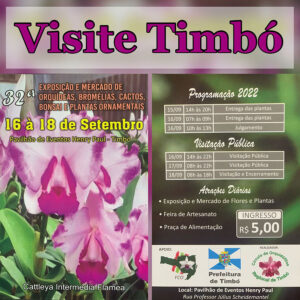 Entre os dias 16 e 18 de setembro, o Pavilhão de Eventos Henry Paul será sede da 32ª Exposição e Mercado de Orquídeas, Bromélias, Cactos, Bonsai e Plantas Ornamentais. O evento é promovido pelo Círculo de Orquidófilos Regional de Timbó e conta com o apoio da Prefeitura de Timbó.
