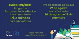 A Fundação de Amparo à Pesquisa e Inovação do Estado de Santa Catarina (Fapesc) vai destinar R$ 2 milhões ao Programa Estruturante Acadêmico – Apoio à Infraestrutura de Laboratórios Acadêmicos do Estado de Santa Catarina. As propostas, que precisam ser pré-selecionadas pelas Instituições de Ensino Superior (IES), devem ser submetidas na Plataforma da Fapesc entre 30 de agosto e 15 de setembro.