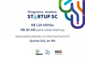A Fundação de Amparo à Pesquisa e Inovação do Estado de Santa Catarina (Fapesc) e o Serviço Brasileiro de Apoio às Micro e Pequenas Empresas em Santa Catarina (Sebrae) vão apresentar, nesta quinta-feira, 14, às 16 horas, durante o Startup Summit, as 25 startups aprovadas no Programa Acelera Startup SC. As empresas receberão R$ 1,25 milhão – R$ 50 mil cada uma.