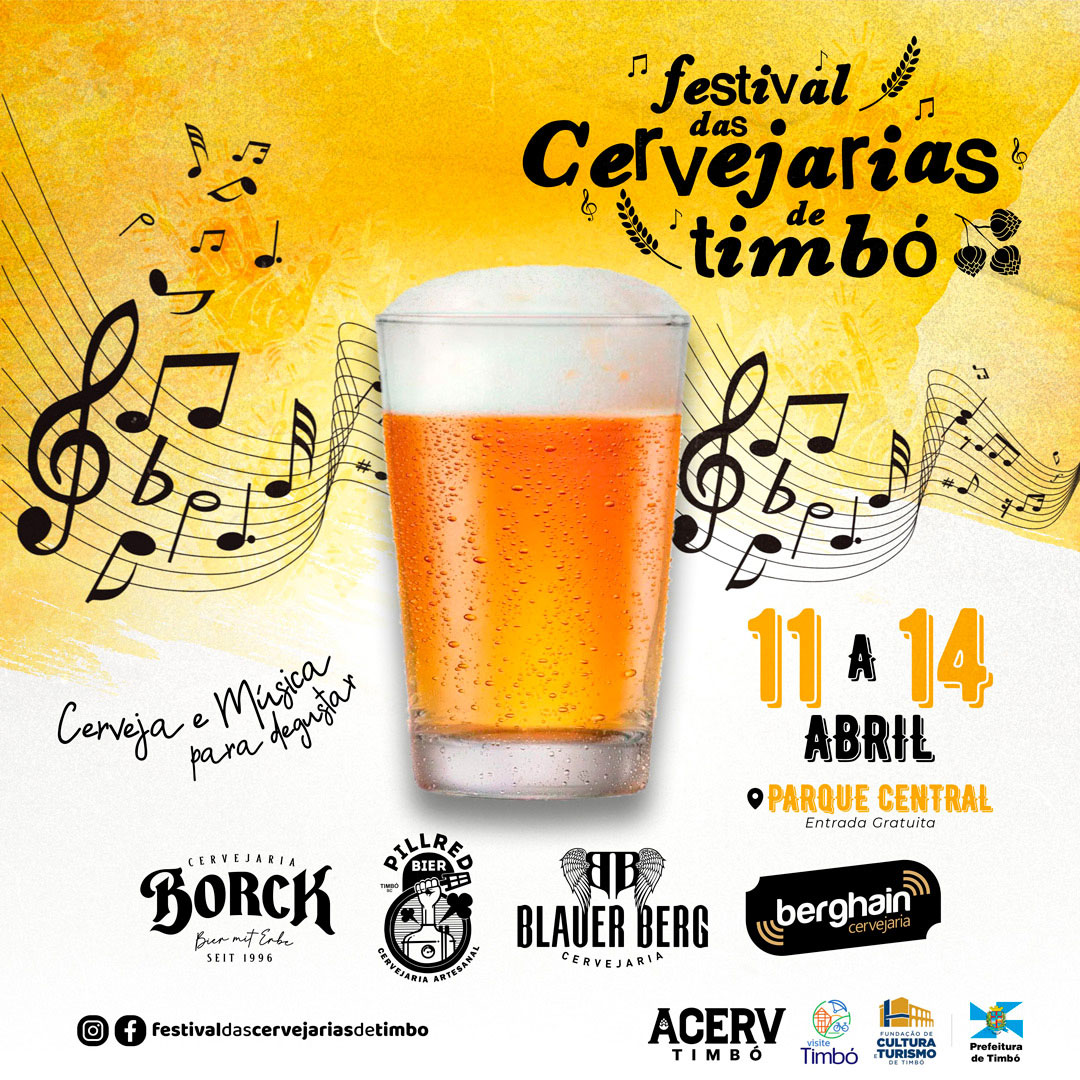 Um dos eventos mais queridos da região está de volta: o Festival das Cervejarias de Timbó acontece entre os dias 11 a 14 de abril, no Parque Central. Muita cerveja e música para degustar.
