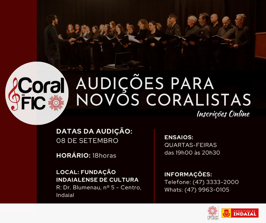 Há vagas no Coral para Baixos, Tenores e Sopranos. Caso o interessado não saiba em qual naipe se encaixa, poderá fazer o teste independente. A audição acontecerá nesta quarta, 8 de setembro, às 18h, na Fundação Indaialense de Cultura (Rua Dr. Blumenau, nº 5, Centro).