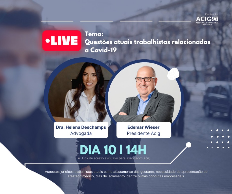 Por conta do crescente número de casos de Covid-19 e das mudanças nas portarias do Ministério da Saúde e decretos referentes às medidas sanitárias de prevenção ao contágio, as relações de trabalho têm sido influenciadas. Para dar respaldo ao empresário local, a Associação Empresarial de Gaspar (Acig) promove no dia 10 de fevereiro uma live com a advogada Helena Deschamps, especialista em direito do trabalho.
