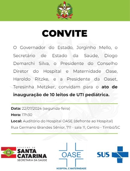 O governador do Estado de Santa Catarina, Jorginho Mello, juntamente com o secretário de Estado da Saúde, Diogo Demarchi Silva, visita o Hospital e Maternidade Oase na segunda-feira, dia 22 de julho, às 17h30min.