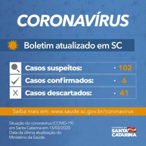 Março 15, 2020A Secretaria de Estado da Saúde de Santa Catarina confirmou neste domingo, 15, o sexto caso do novo coronavírus (COVID-19). O paciente é um homem morador do município de Braço do Norte, no Sul do Estado, e tem histórico de viagem ao exterior. Ele está internado em isolamento. Além do paciente de Braço do Norte, já foram confirmados dois casos nos municípios de Rancho Queimado, dois em Florianópolis e um em Joinville.