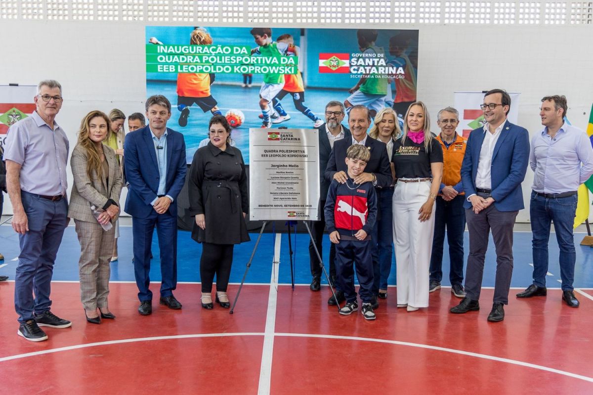 O governador Jorginho Mello inaugurou nesta quinta-feira, 11, a nova quadra poliesportiva coberta da Escola de Educação Básica Leopoldo Koprowski, em Benedito Novo. Mais do que um investimento em infraestrutura, o espaço representa um compromisso com o desenvolvimento integral dos alunos e o fortalecimento da comunidade escolar.