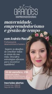 Grandes Empreendedoras realiza 8º encontro nesta segunda-feira, dia 16, com o tema “Maternidade, empreendedorismo e gestão de tempo”