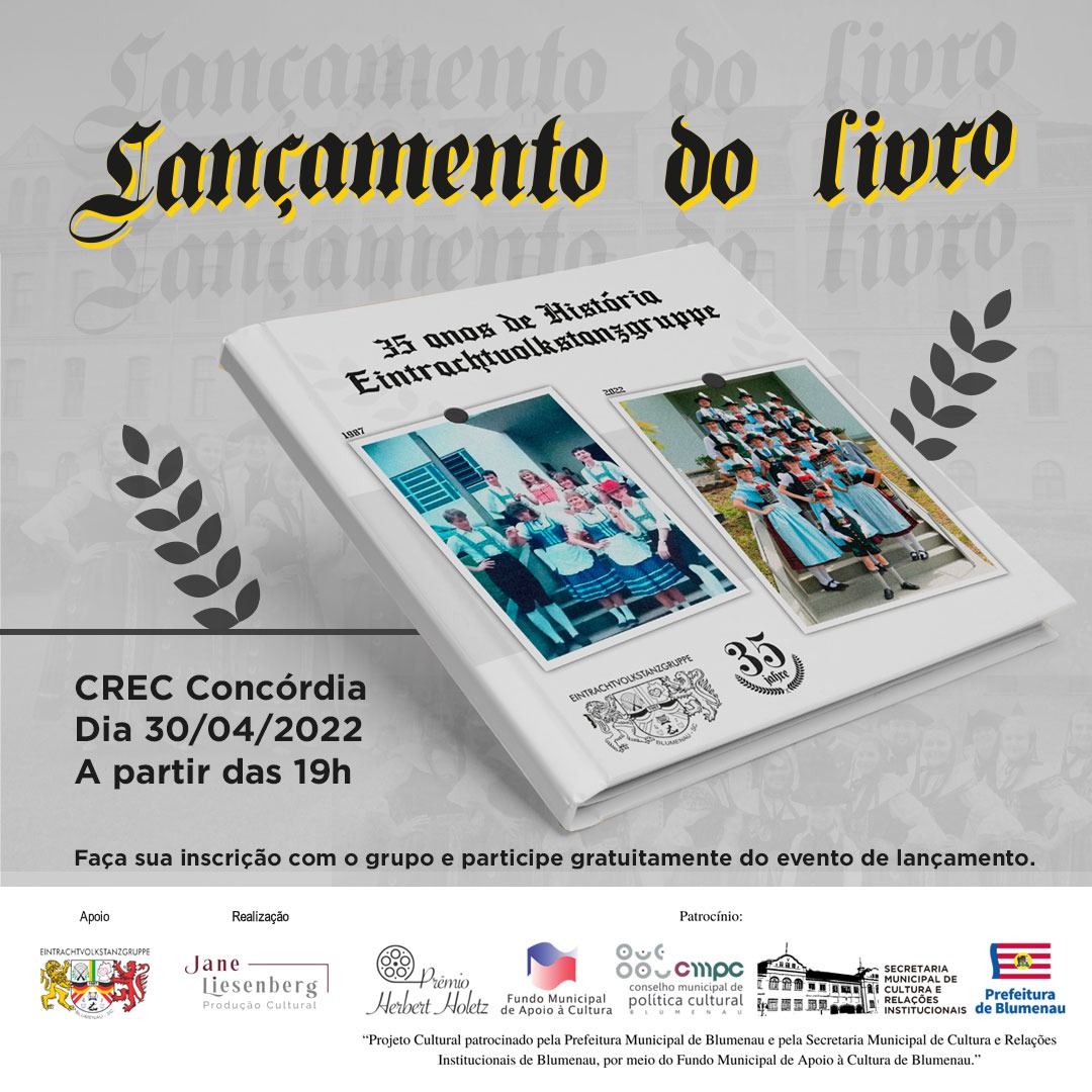 Trinta e cinco anos de trajetória e boas histórias para contar. No dia 30 de abril, ocorre o lançamento do livro 35 Anos Eintrachtvolkstanzgruppe, um registro de memórias da trajetória cultural do Grupo de Danças Folclóricas Alemãs Eintrachtvolkstanzgruppe, por meio de levantamento, pesquisa, organização e edição de obra comemorativa ao grupo que completa 35 anos em maio. O evento acontece às 19h, no C.R.E. Clube Concórdia, na Itoupava Central, em Blumenau, com entrada gratuita, e conta com a presença dos autores Hélcio Dieter Liesenberg e Jane Mary Schmitz Liesenberg. O livro será distribuído gratuitamente à comunidade.