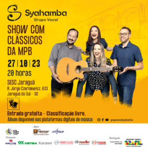 Música Popular Brasileira. Nesta sexta-feira, dia 27 de outubro, o Grupo Vocal Syahamba faz show de lançamento do primeiro álbum do quarteto no Teatro do Sesc Jaraguá do Sul, em Santa Catarina. O evento ocorre às 20h, com entrada gratuita e aberta a toda comunidade, com retirada de ingresso uma hora antes do show. Haverá tradução em LIBRAS.