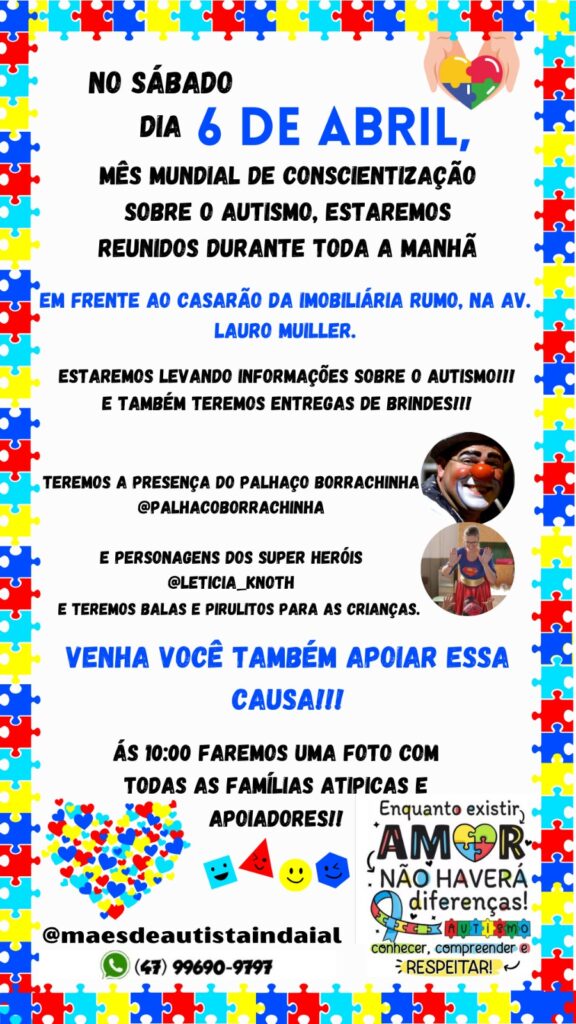 No dia 6 de abril, sábado, a partir das 8h, o grupo Mães de Autistas irá realizar um evento de informação e conscientização sobre o autismo na Avenida Lauro Muller, em frente ao Casarão da Imobiliária Rumo. Será uma oportunidade de entrega de panfletos informativos, entrega de brindes, muitas brincadeiras com a presença do palhaço borrachinha e também a presença da personagem dos super heróis Letícia. Serão distribuídos também balas e pirulitos para as crianças. A partir das 10h será feita a foto oficial com todas as famílias atípicas e apoiadores.
