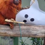Mico-leão-dourado e Mico-leão-preto: vão se deliciar e brincar com abóboras decorativas e envelopes no formato de teia de aranha recheadas com uva passa;