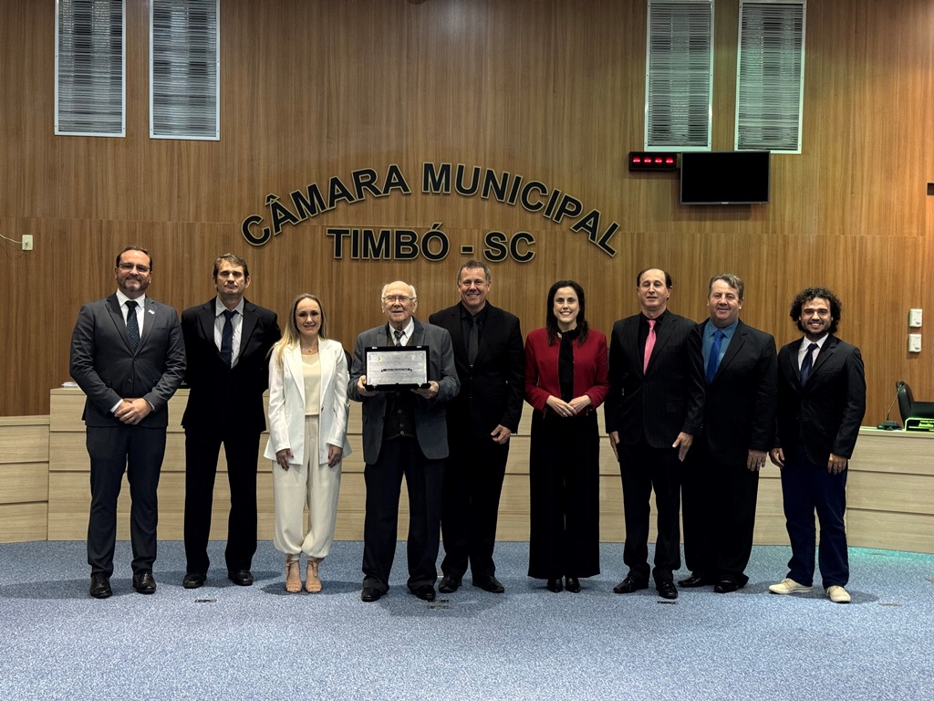A noite do dia 11 de junho foi especial na Câmara de Vereadores de Timbó, com a Sessão Solene de entrega do título de cidadão honorário timboense ao sr. Hans Hermann Ziel.