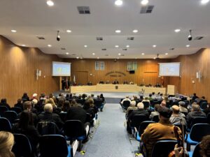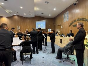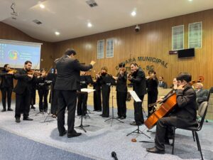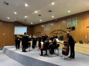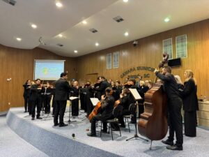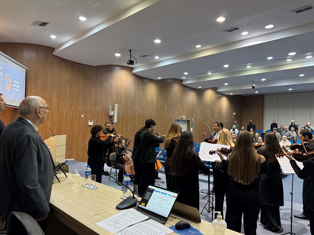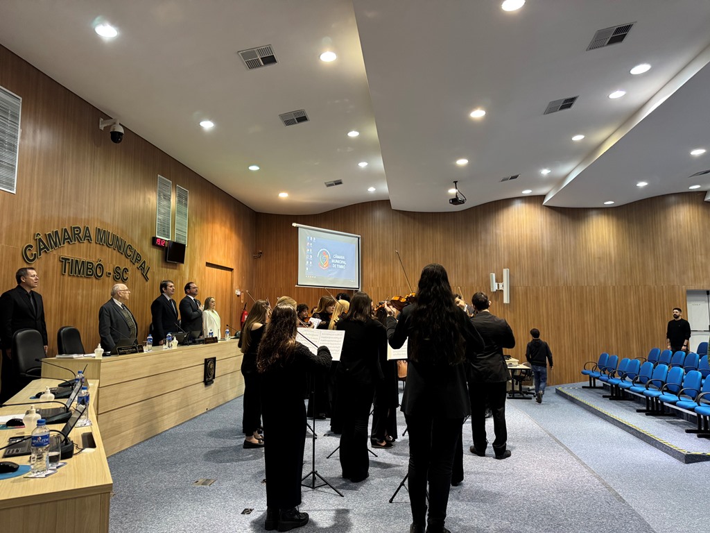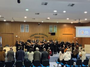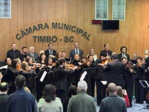 Para fechar a solenidade, a Orquestra de Câmara de Timbó e o Coral Leopoldo Kurtz se uniram para entoar o Hino de Timbó.