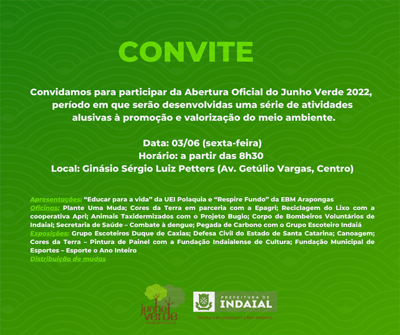 Devido à previsão de chuva nesta sexta-feira (3), em Indaial, a Abertura Oficial do Junho Verde 2022 será transferida da Beira-Rio para o Ginásio Sérgio Luiz Petters, no Centro. Durante a manhã, a partir das 8h30, diversas atividades estão programadas no local com distribuição de mudas e apresentações culturais da UEI Polaquia e da EBM Arapongas.