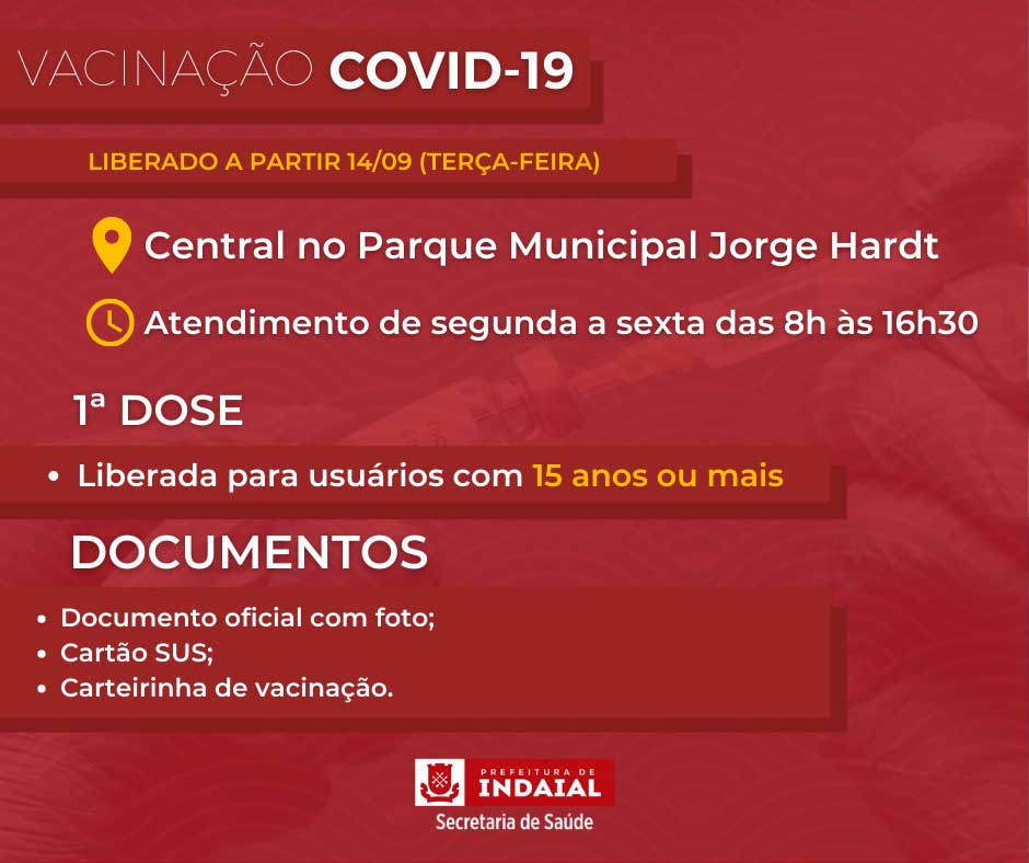 A partir desta terça, 14 de setembro, a Secretaria de Saúde de Indaial inicia a vacinação contra a Covid-19 em pessoas com 15 anos ou mais. É preciso apresentar carteirinha de vacinação, Cartão do SUS e documento oficial com foto. O atendimento nas cabines acontece na Central instalada no Parque Municipal Jorge Hardt, de segunda a sexta, das 8h às 16h30, por ordem de chegada, através do sistema de senhas.