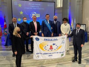 Na segunda, 21 de março, teve comemoração dupla para Indaial. O Município, além de celebrar seus 88 anos de emancipação político-administrativa, foi agraciado, na Itália, com o reconhecimento internacional de Cidade Sul-Americana do Desporto 2022. O prefeito, André Moser, acompanhado do diretor-presidente da Fundação Municipal de Esportes, Ademir Packer, esteve no evento, recebendo o título chancelado pelo Parlamento Europeu e Unesco.