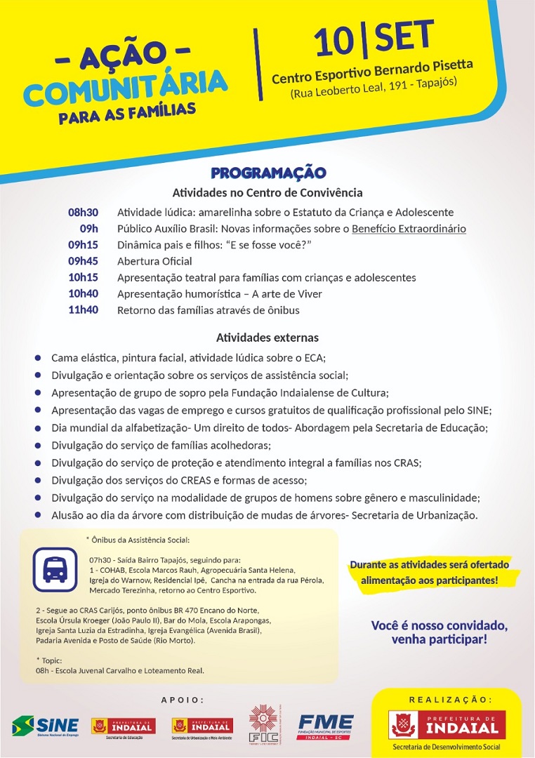 No dia 10 de setembro (sábado), a Secretaria de Desenvolvimento Social de Indaial promoverá uma Ação Comunitária para as Famílias no Centro Esportivo Bernardo Pisetta (rua Leoberto Leal, 191, Tapajós). Diversas atividades gratuitas serão realizadas em parceria com as Secretarias de Educação, Urbanização e Meio Ambiente, Fundação Municipal de Esportes, Fundação Indaialense de Cultura e Sine.