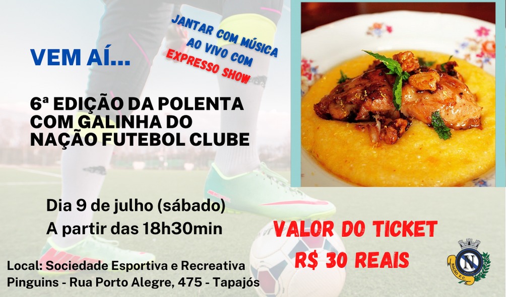 No dia 9 de julho, sábado, a diretoria do Nação Futebol Clube de Indaial irá realizar a 6ª edição da tradicional Polenta com Galinha a partir das 18h30min na Sociedade Esportiva e Recreativa Pinguins, na Rua Porto Alegre nº 475 no bairro Tapajós.