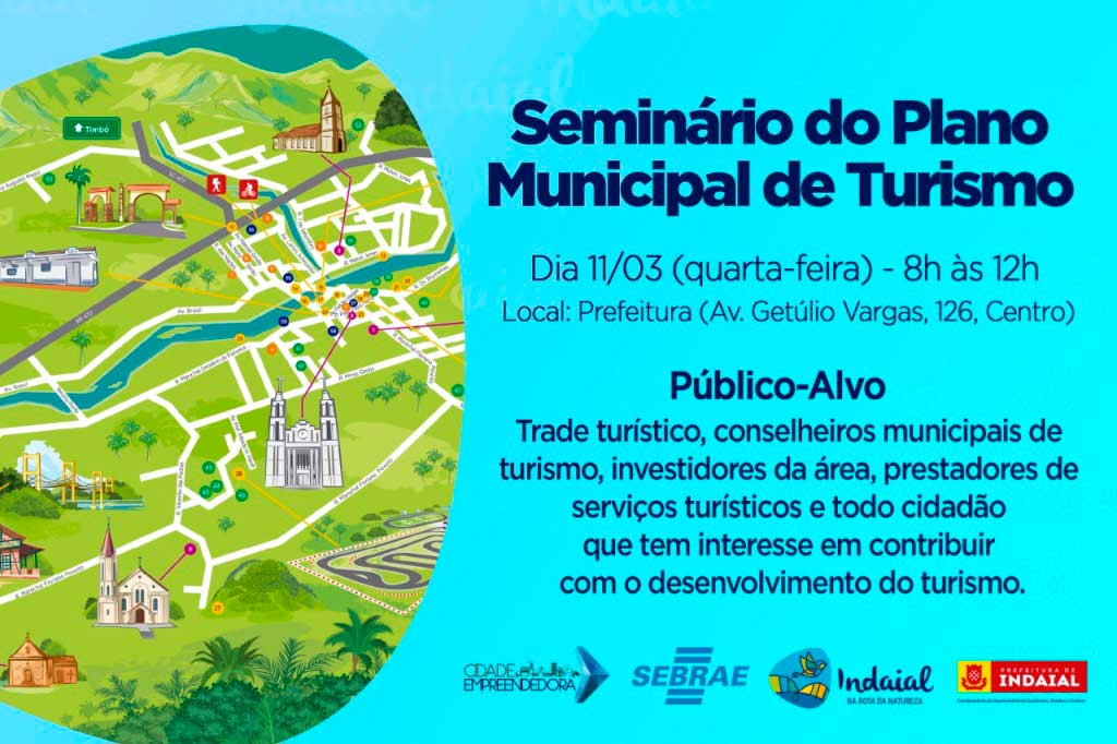Março 10, 2020Nesta quarta, 11 de março, a Coordenadoria de Desenvolvimento Econômico, Eventos e Turismo irá promover o 1º Seminário de planejamento do Plano Municipal de Turismo de Indaial. O encontro acontecerá no Salão Nobre, segundo piso da Prefeitura (Avenida Getúlio Vargas, 126, Centro), das 8h às 12h.