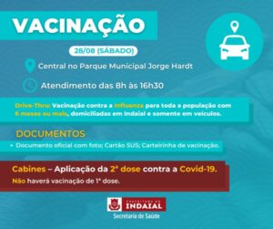 Neste sábado, 28 de agosto, a Secretaria de Saúde irá promover uma edição especial do Drive-Thru para vacinação contra a Influenza (Gripe). A ação acontecerá no Parque Municipal Jorge Hardt, das 8h às 16h30. No dia, a imunização dentro dos veículos (carros e motos, por exemplo) será disponibilizada para todas as pessoas domiciliadas em Indaial com seis meses ou mais. É preciso apresentar carteirinha de vacinação, Cartão do SUS e documento oficial com foto.