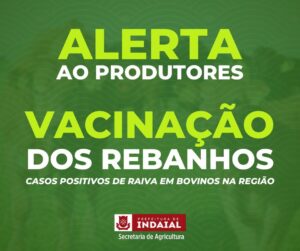A Secretaria de Agricultura, em parceria com a Cidasc, alerta os produtores de Indaial sobre casos de raiva em BOVINOS na região. A orientação é que os produtores vacinem seus rebanhos, lembrando que os animais vacinados pela primeira vez devem receber uma segunda dose 30 dias após a primeira imunização.