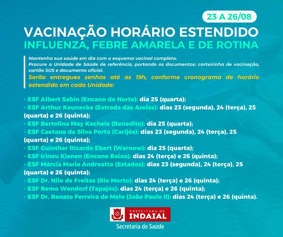 A Secretaria de Saúde de Indaial promove nesta semana, de 23 a 26 de agosto, um mutirão de imunização contra a Influenza, Febre Amarela e demais vacinas de rotina. Nesse período serão entregues senhas à comunidade até as 19h, conforme cronograma de horário estendido em cada Unidade.
