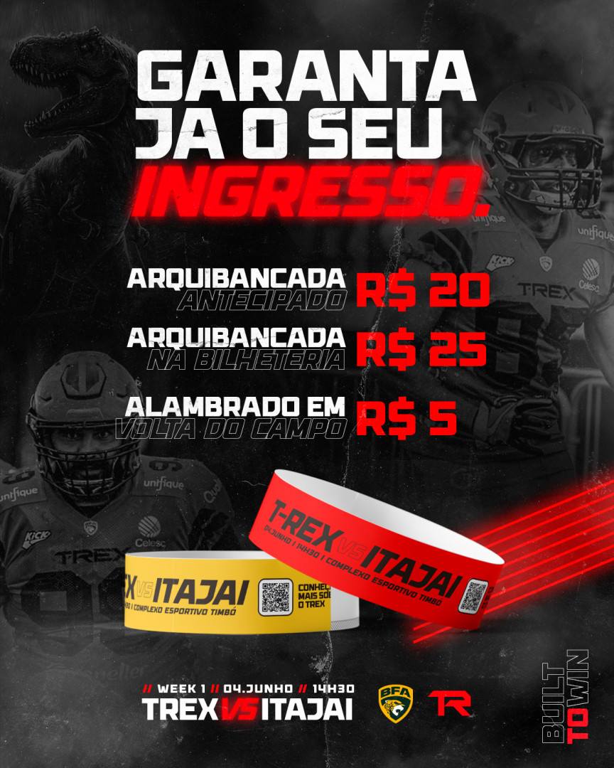 Os ingressos para a partida entre T-Rex x Itajaí Almirantes já estão à venda. O preço das entradas é de R$ 20,00 arquibancada, 5,00 alambrado e 5,00 estacionamento. No dia do jogo, os ingressos para a arquibancada serão por R$ 25,00. Os pontos de venda são na Academia T2 Club, Life Suplementos e no Office do T-Rex.