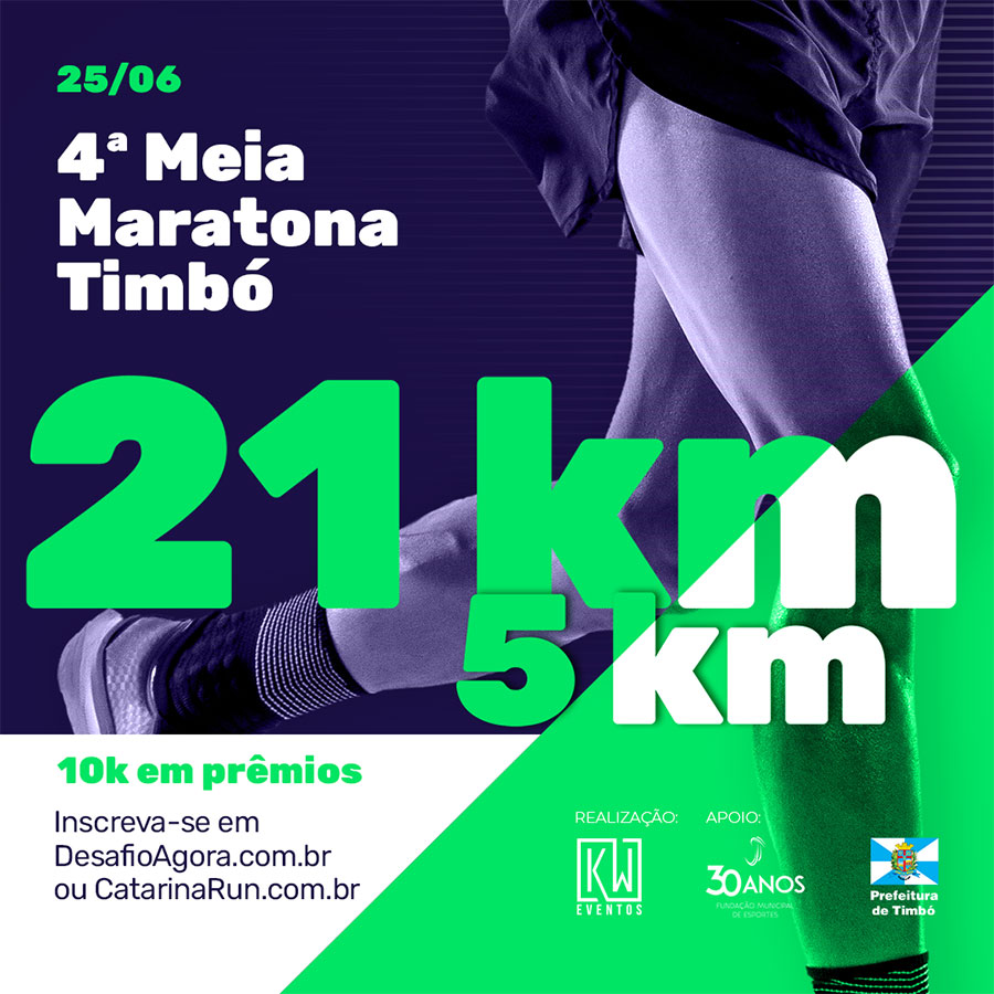 Estão abertas as inscrições para a 4ª Meia Maratona do município, promovida pela Prefeitura de Timbó, através da Fundação Municipal de Esportes (FME). O evento acontece dia 25 de junho, no Parque Henry Paul.