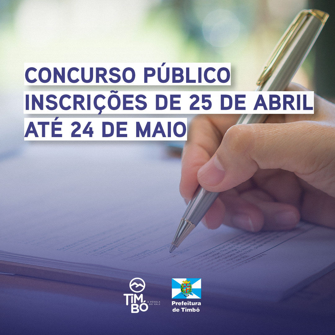 A Prefeitura de Timbó informa que estão abertas, a partir do dia 25 de abril, as inscrições para os processos seletivos de Concurso Público e Emprego Público no município. Os editais estão disponíveis no site da Prefeitura na aba Concursos, acesse aqui. As inscrições vão até o dia 24 de maio e podem ser feitas no site https://concursos.furb.br/