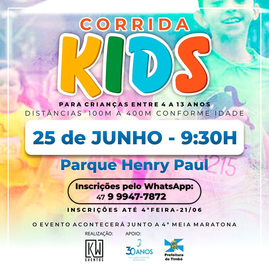 No próximo domingo, dia 25 de junho, acontece a 4ª Meia Maratona de Timbó e como parte do evento também irá acontecer a Corrida Kids, voltada para crianças entre 4 e 13 anos.