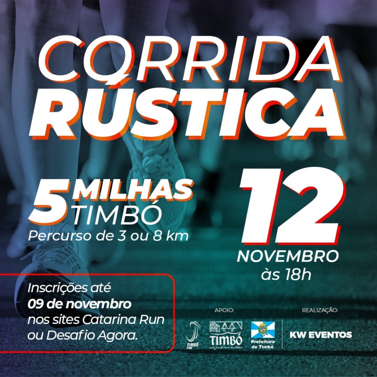 Estão abertas as inscrições para a Corrida Rústica Timbó 5 milhas, que vai acontecer no dia 12 de novembro, dentro do Expobike 2022.