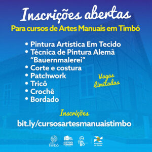 Estão abertas as inscrições para os cursos de Artes Manuais, da Fundação de Cultura e Turismo de Timbó. Os cursos serão de Pintura Artística em Tecido e na Técnica de Pintura Alemã “Bauernmalerei”, corte e costura, “patchwork” e tricô, crochê e bordado. Confira abaixo os dias e horários disponíveis para cada curso.