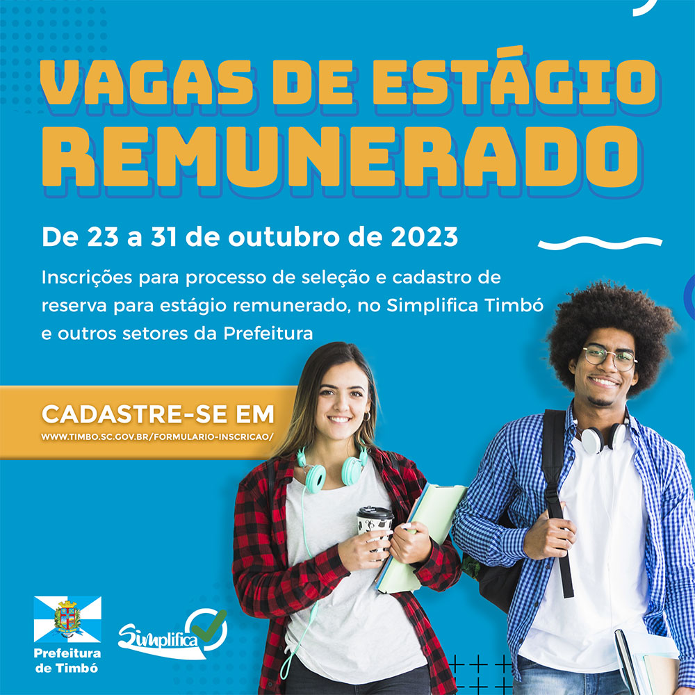 A Prefeitura de Timbó está com inscrições abertas para processo seletivo de estágio remunerado e cadastro de reserva, para atuar no Simplifica Timbó e outros setores da Prefeitura.