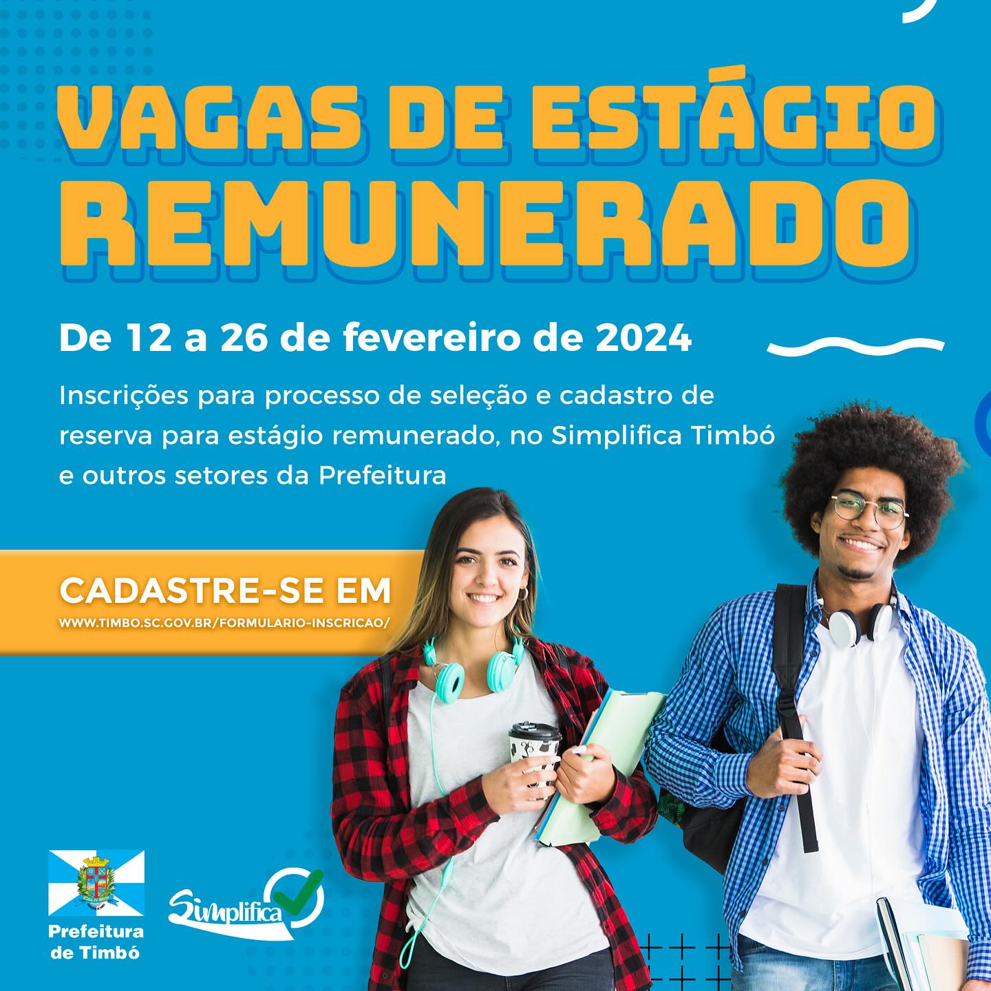 Estão abertas as inscrições do processo seletivo de estágio remunerado e cadastro de reserva, para atuar no Simplifica Timbó e outros setores da Prefeitura.