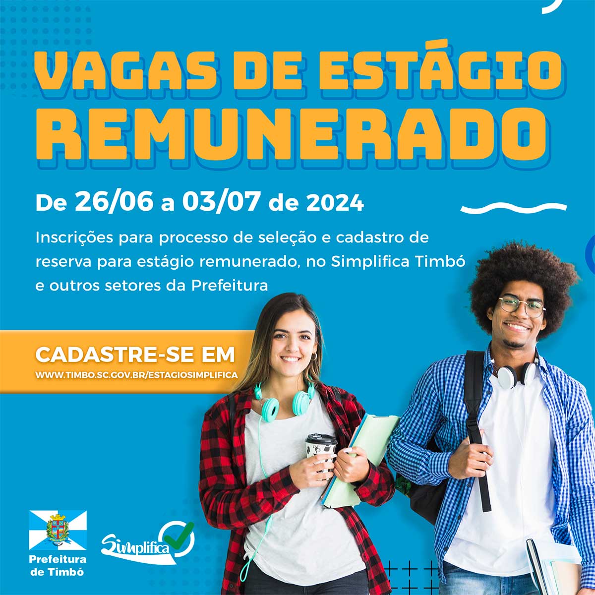Estão abertas as inscrições do processo seletivo de estágio remunerado e cadastro de reserva, para atuar no Simplifica Timbó e outros setores da Prefeitura.