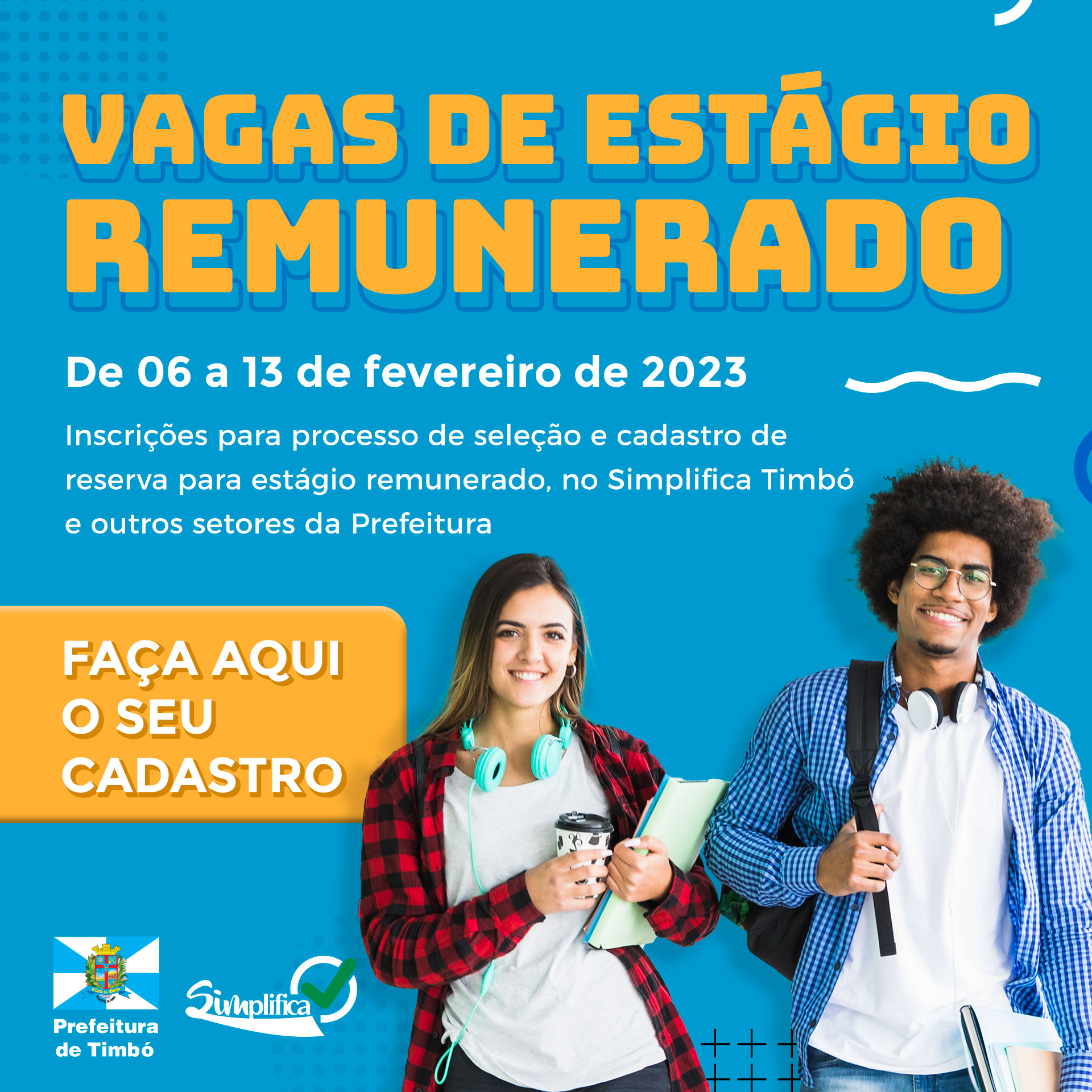 A Prefeitura de Timbó está com inscrições abertas para processo seletivo de estágio remunerado e cadastro de reserva, para atuar no Simplifica Timbó e outros setores da Prefeitura.