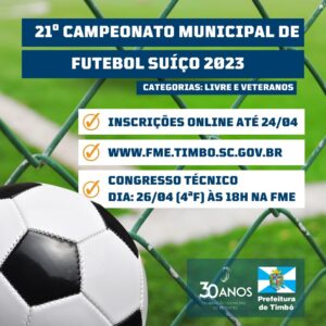 Estão abertas até o dia 24 de abril as inscrições para o 21º Municipal de Futebol Suíço Livre de Timbó, promovido pela Fundação Municipal de Esportes (FME) de Timbó.