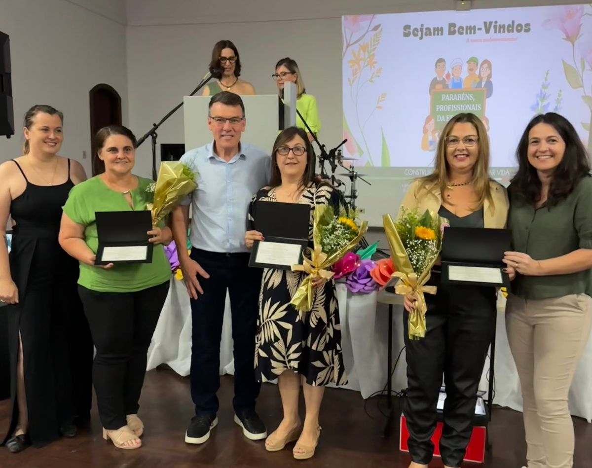 Um dos momentos mais emocionantes da noite foi a homenagem prestada às professoras Marilete Pisa Poffo, Denise André e Elisa Maria Fava, que se aposentaram após anos de contribuição à formação de gerações. O gesto simbolizou gratidão, respeito e admiração por todo o legado deixado na rede municipal.