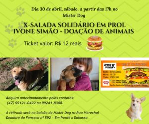 No dia 30 de abril, sábado, a equipe da Ivone Simão – Doação de Animais irá realizar o X Salada Solidário, a partir das 17h, no Mister Dog, que está em novo endereço na Rua Marechal Deodoro da Fonseca nº 592, em frente à Dokassa. O valor do Ticket é de R$ 12 reais e pode ser adquirido antecipadamente através dos contatos: (47) 99121 – 0422 ou (47) 99241 – 8308. O lanche estará à disposição no balcão do Mister Dog.
