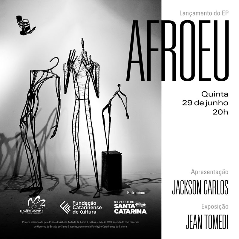 O projeto AfroEu, de Jackson Carlos, é contemplado pelo Prêmio Elisabete Anderle de Apoio à Cultura (2020), executado com recursos do Governo do Estado de Santa Catarina, por meio da Fundação Catarinense de Cultura. Acompanhe as novidades pelo www.instagram.com/jacksoncarlosmusic
