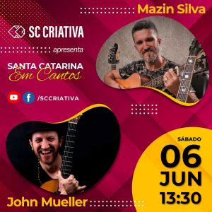 Música catarinense. Neste sábado, dia 06 de junho, o cantor e compositor John Mueller e o guitarrista e violeiro Mazin Silva se apresentam na live show Santa Catarina Em Cantos, do SC Criativa. Os artistas blumenauenses irão tocar, cantar e contar um pouco da trajetória de cada um, às 13h30, pelos canais do Youtube e Facebook @sccriativa. Mueller e Mazin são catarinenses premiados, entre os destaques estão Prêmio Grão de Música a John Mueller, em 2019, e Prêmio Samsung E-Festival Instrumental a Mazin Silva, em 2018. A live show Santa Catarina Em Cantos é um espaço direcionado a entrevistas e apresentações culturais. Já o movimento SC Criativa surgiu em dezembro de 2018 e é integrado por profissionais de design, animação, comunicação, moda, games, arquitetura, tecnologia, turismo, música, teatro e todos que se conectam para levar cultura e reflexão crítica à comunidade.