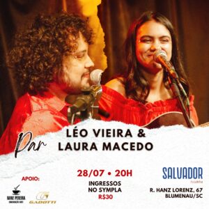 Canções em par, em duo. Nesta sexta-feira, dia 28 de julho, os cantores e compositores Léo Vieira (SC) e Laura Macedo (SP) fazem show-duo no Salvador Cozinha, em Blumenau. O evento ocorre às 20h e os ingressos limitados já estão à venda pelo Sympla a R$30. Parceiros no palco e na vida, após o sucesso de público em show especial no dia dos namorados em São Paulo, os jovens artistas trazem a Blumenau o projeto “Par”, e apresentam um repertório recheado de canções autorais, com interpretações de clássicos, que passeiam por obras de Marcelo Jeneci, a Beto Guedes e Almir Sater, em um ambiente romântico e intimista. Acompanhe as novidades e siga os artistas pelo www.instagram.com/leovieira.folk e www.instagram.com/lauramacedoo