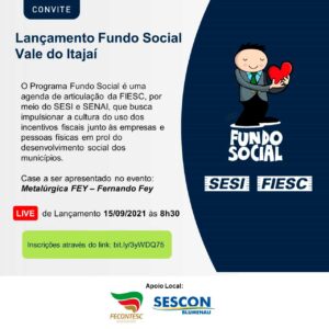 Com a proposta de apresentar o Fundo Social, entidades e projetos, a FIESC promove para o Vale do Itajaí no dia 15 de setembro uma live sobre o tema. O evento será transmitido via Youtube às 8h30 e as inscrições podem ser feitas pelo link.