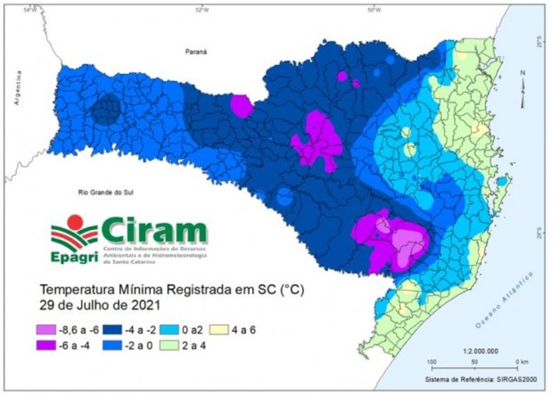 Em Bom Jardim da Serra os termômetros marcaram -8,6°C, a menor temperatura registrada no Brasil neste ano. O recorde anterior era de -8,2°C registrado em 20 de julho, em Urupema, conforme medição do Centro de Informações de Recursos Ambientais e de Hidrometeorologia de Santa Catarina (Epagri/Ciram).