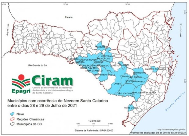 Mapa de localização dos municípios com registro de neve em SC entre os dias 28 e 29/07/2021. (Elaborado por: Maikon Alves – Técnico em Meteorologia).
