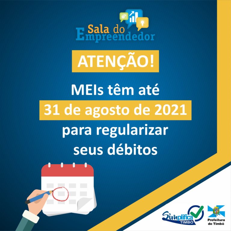 A Sala do Empreendedor de Timbó alerta os Microempreendedores Individuais (MEIs) sobre mudanças na regularização de débitos. Os MEIs poderão regularizar seus débitos (INSS, ISS e ICMS) por meio de recolhimento em DAS, acessando o PGMEI, ou parcelando, até o dia 31 de agosto.