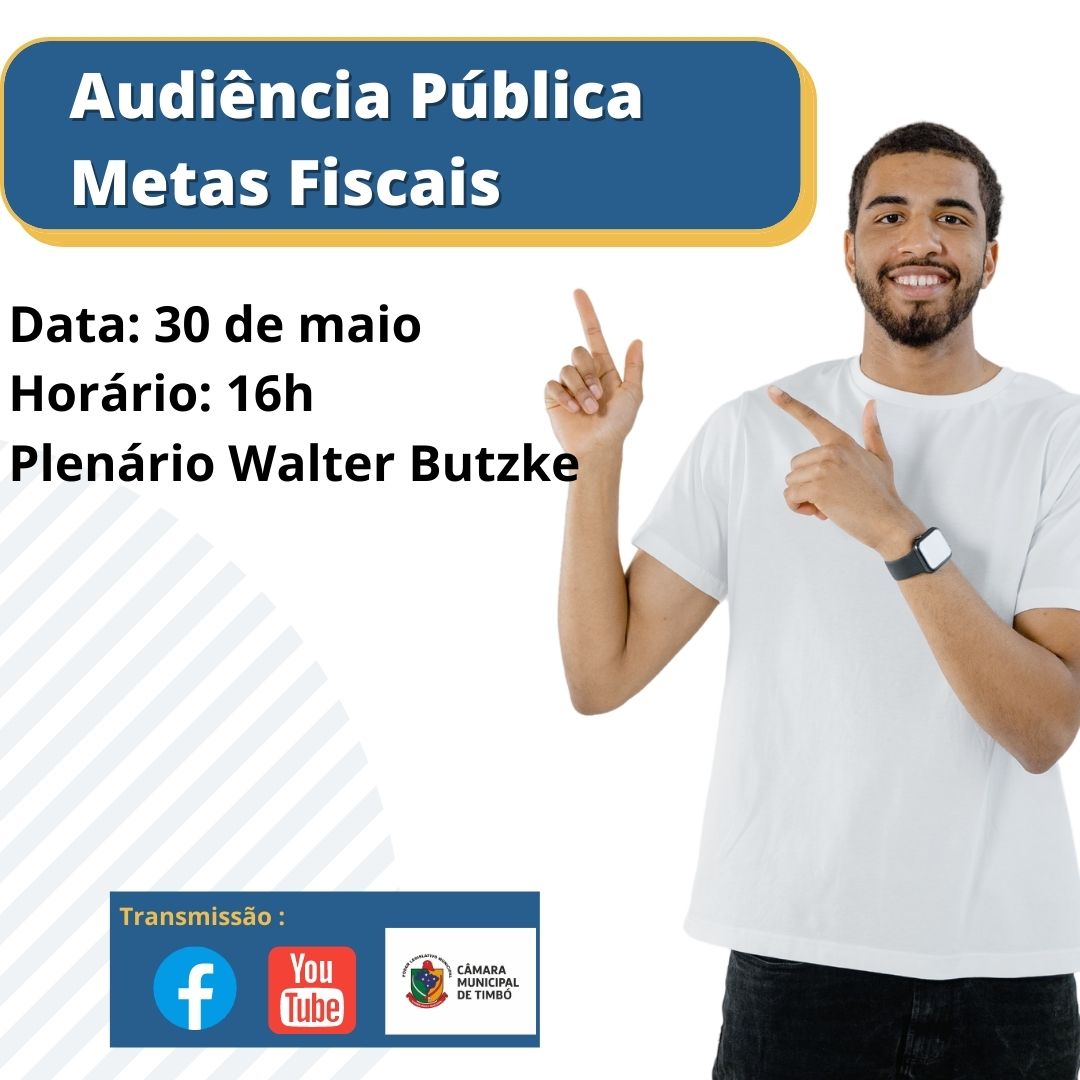 A Câmara Municipal de Timbó convida a comunidade a participar da Audiência Pública para demonstração e avaliação, a pedido da Comissão de Orçamento, Finanças e Contas Públicas, das Metas Fiscais pelo Poder Executivo relativas ao Primeiro Quadrimestre de 2022, em atendimento ao disposto no §4.º do art. 9º da Lei Complementar Federal n.º 101/2000.